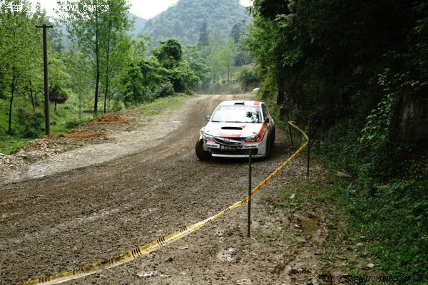 第3天比赛的第2段因雨季原计划要被取消,但组委会经过实测堪路后还是决定恢复原定的桂花赛段的比赛。可悲的是经过两天的细雨后,原本泥泞的赛道变得更加恶劣,有如1943年春天的苏联西部。笔者占据的拍摄阵位是距离重点前的100米的山坡上,可以拍摄到赛车经过一个长达130米的长下坡后,紧接着是一个右3的弯道,然后再接着150米的冲刺直抵重点。